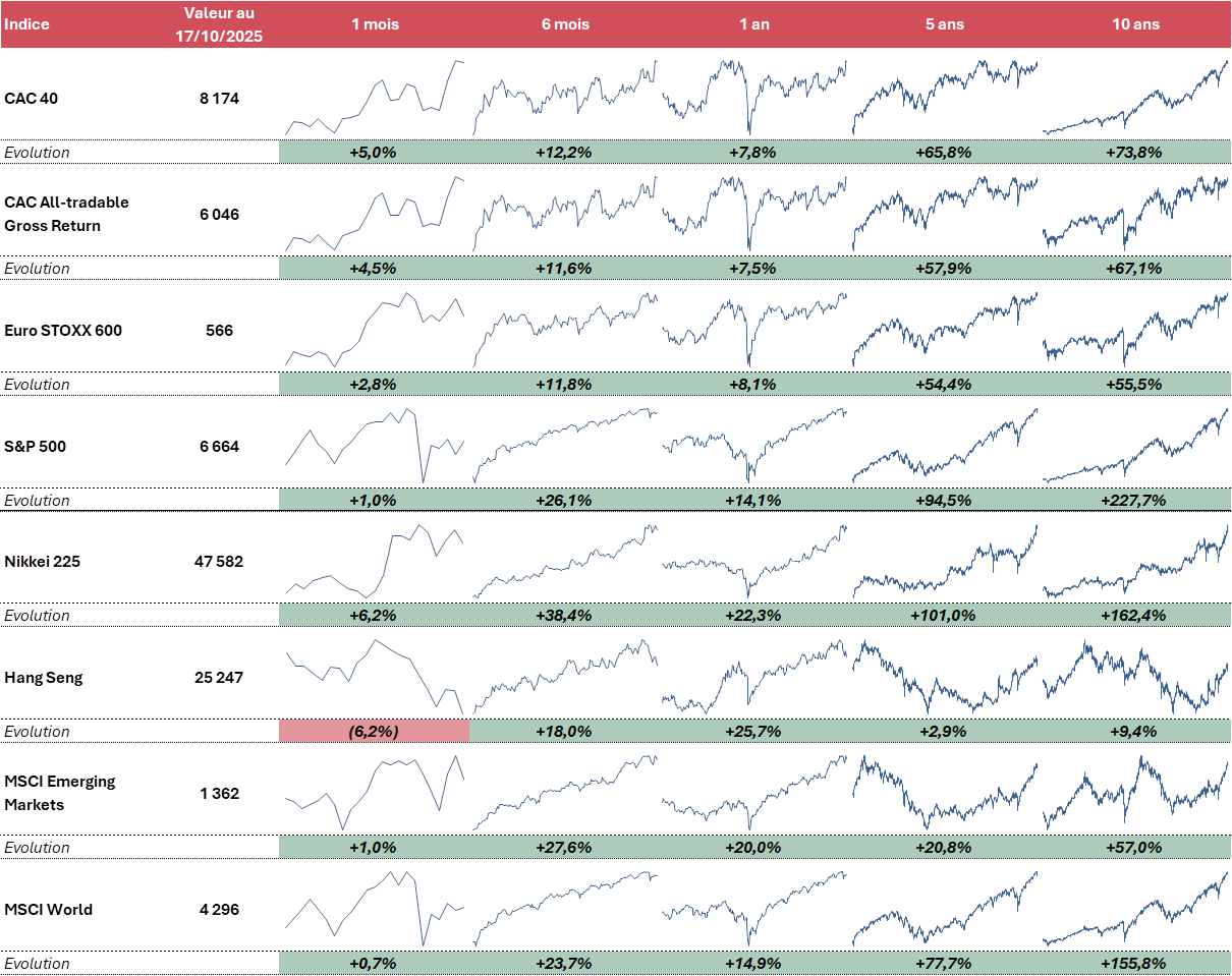 Fait notoire à ce jour, nous constatons que la plupart des grands indices présentent des évolutions positives sur un historique court, moyen et long terme — une configuration plutôt rare.